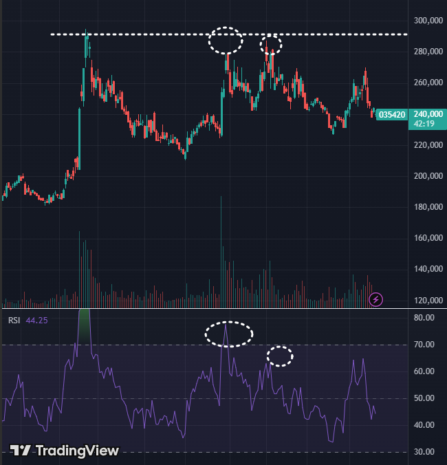 반대로 네이버 주가를 보시면 매물대 상단을 과매수 상태로 돌파하지 못했는데, 과매수(투자 심리가 좋을 때) 매물대를 벗어나지 못해 투심이 안좋아져 하락하는 모습입니다.